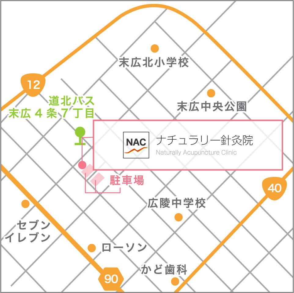 14・15・530番乗車、「末広4条7丁目下車」、徒歩3分。